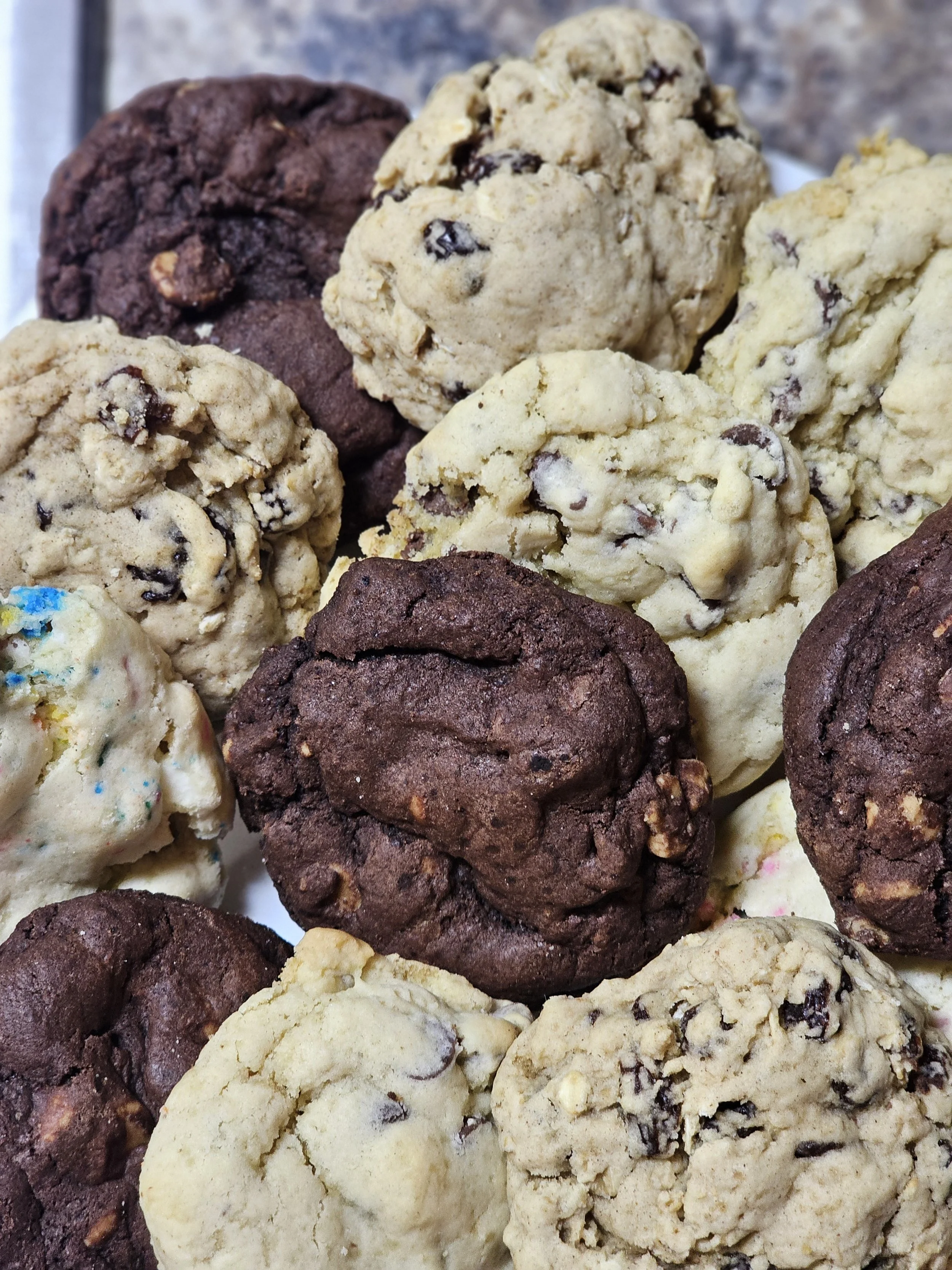 Shop Categories: All Cookies All | Cookies | Gluten-Free Chocolate Chip 2 tray (24 -2oz cookies) $25.00 Gluten-Free Chocolate Chip Batch (Eight-5oz cookies) $30.00 Gluten-Free Chocolate Chip Half Batch (Four- 5oz cookies) $15.00 Gluten-Free Chocolate Chip $4.00 Large Cookie Tray (4 dozen 2oz cookies) $40.00 Small Cookie Tray (2 dozen 2oz cookies) $20.00 Half Batch $15.00 Batch $30.00 Party Pack $120.00 Chocolate Chip $4.00 Chocolate Chip Walnut $4.00 Oatmeal Raisin $4.00 Oatmeal Chocolate Chip $4.00 Chocolate Peanut Butter Chip $4.00 Chocolate Chocolate Chip $4.00 White Chocolate Sugar Cookie $4.00